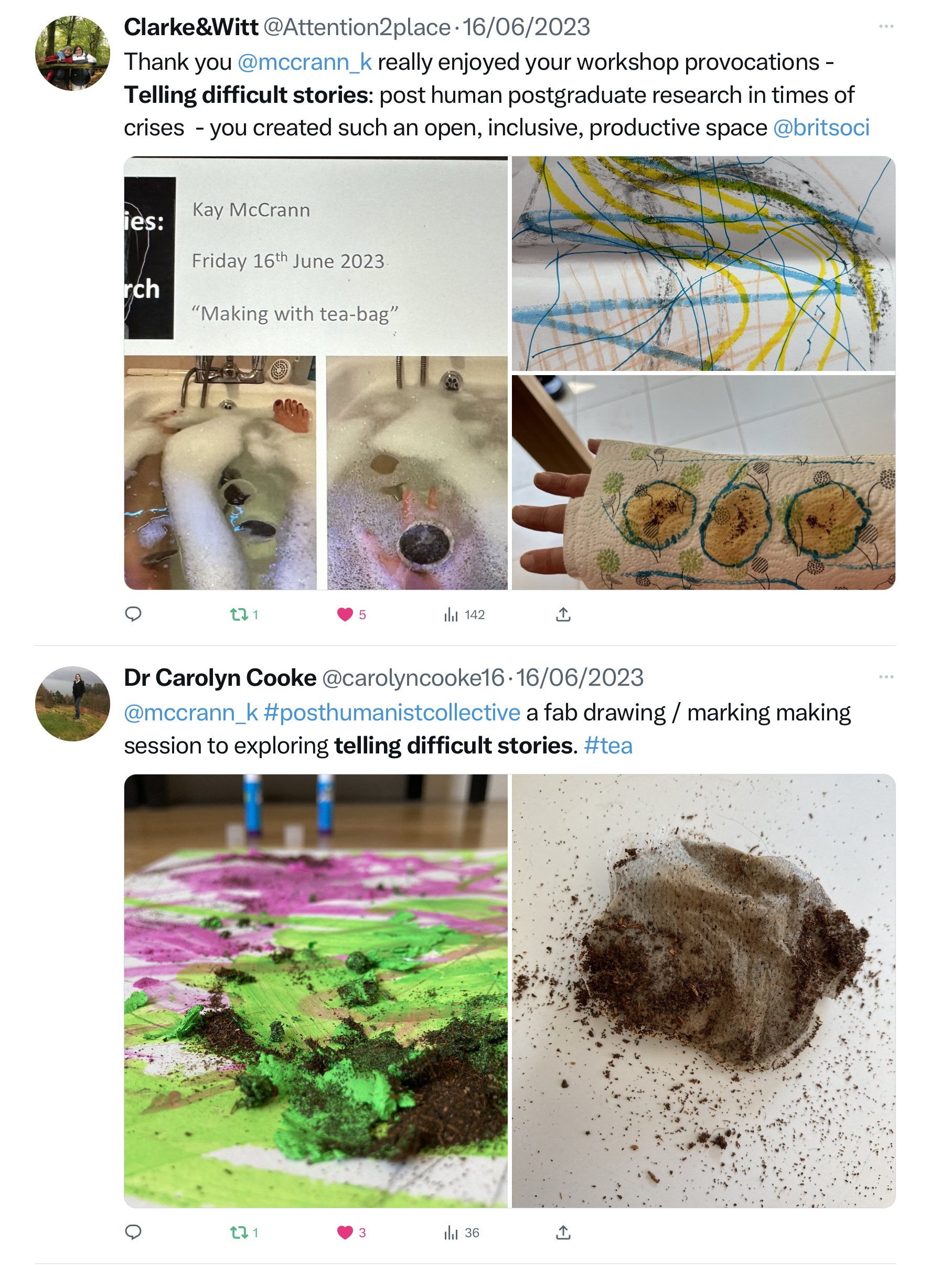 June 2023: Leading a posthumanist postgraduate research online mark-making workshop using teabags to think through difficult stories.